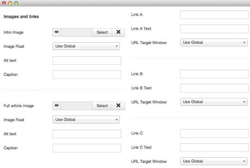 The Images and Links area of the article editing screen gives you the ability to add images in a way that is supported natively by various templates and modules.