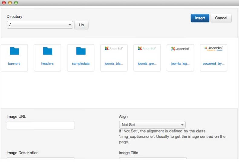 The Joomla media management tool gives you the ability to access files in your media directories, as well as upload new ones. You can access this popup by hitting the Image button under the text editor of your new article page.