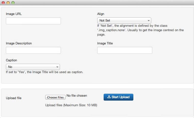 The lower portion of the utility gives you control over how the selected image appears in your article. It also allows you to set an external URL for instances where an image you need to insert is purposely hosted elsewhere.