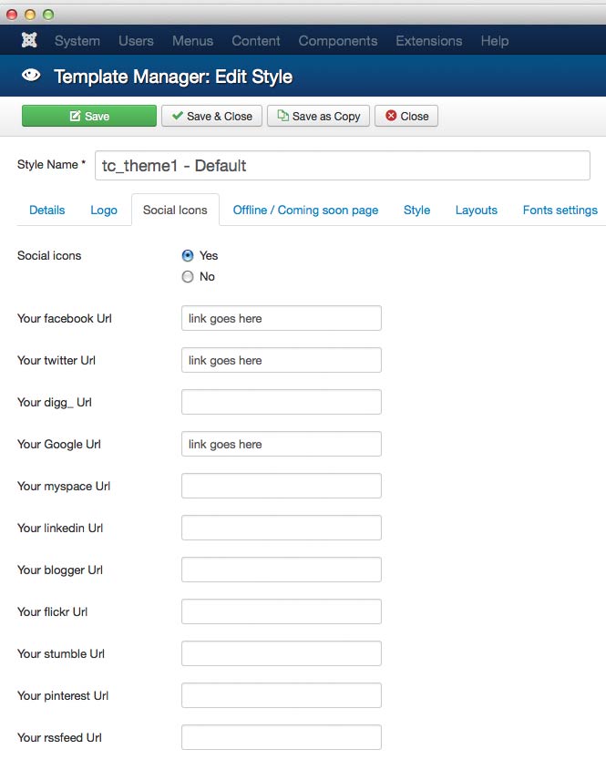 Set Social icons = Yes.