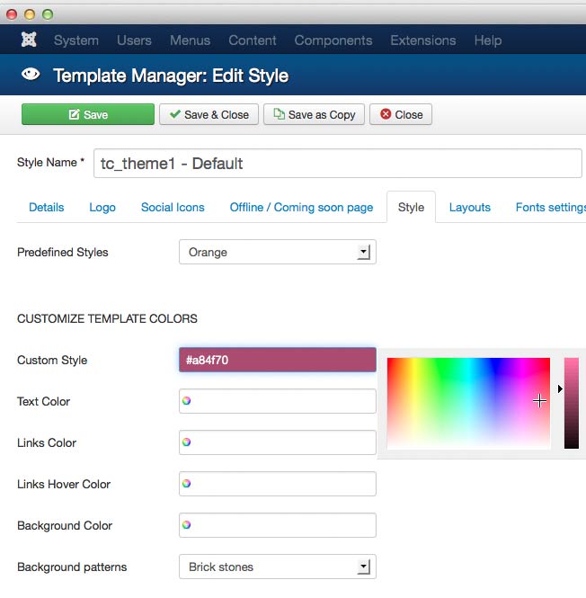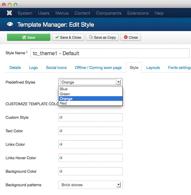 If not satisfied with 4 ready styles on Custom Style select the color you prefer to have for your site.