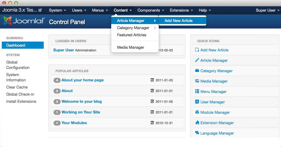 New articles can be added using either the Add Article button or the Article Manager Screen in the Administrator back-end.