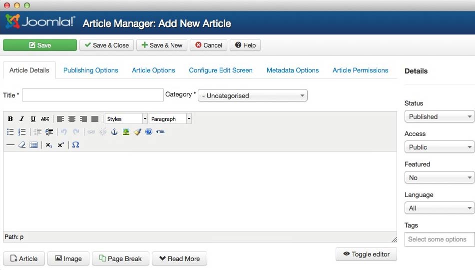 - Now enter your content using the editor in the New Article screen. For more information on the different editors available in Joomla! read: Content Editors.