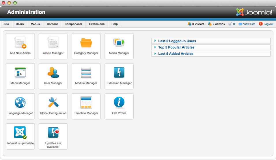 Joomla's backend management interface, Administrator, is one of two sides of Joomla. The Administration area plays host to virtually every type of control and management process you need to configure your site and create content.