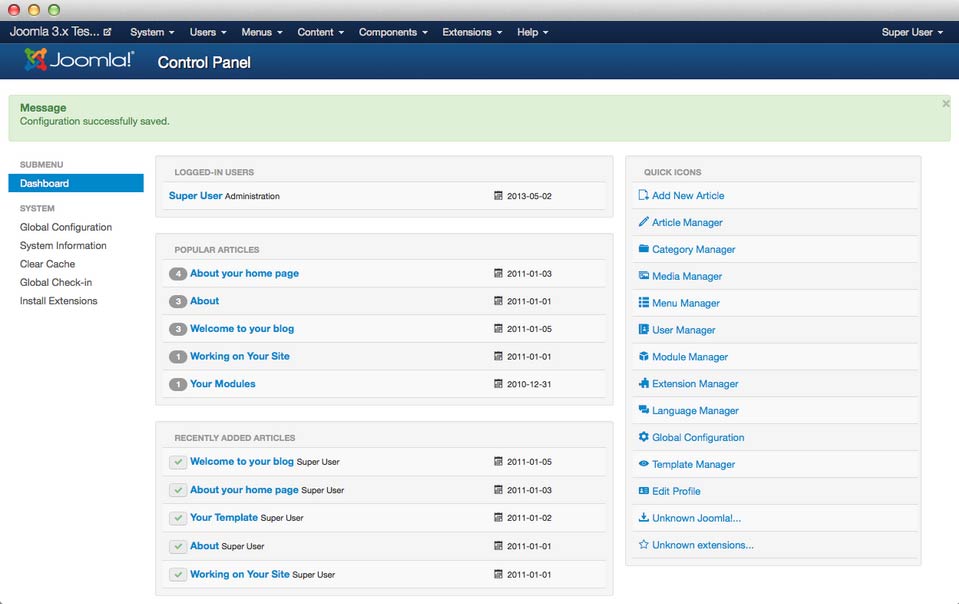 Joomla version 2.5 (above) and 3.x (below) have very different default user interfaces, though much of the same basic principles apply to each. Both of these interfaces will require you to close specific menus before you can skip around to another, provide a dashboard complete with frequently accessed menus and general site information, and enable you to manage virtually every aspect of your site.