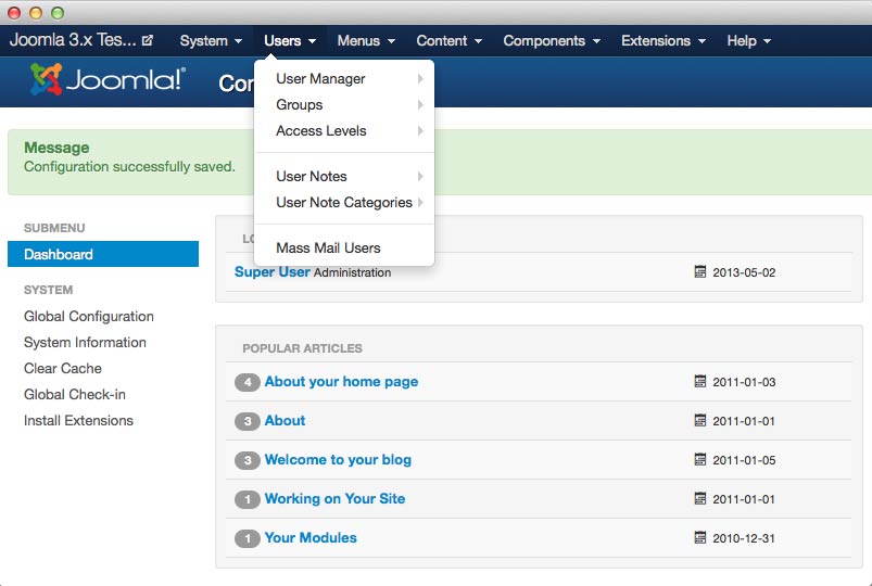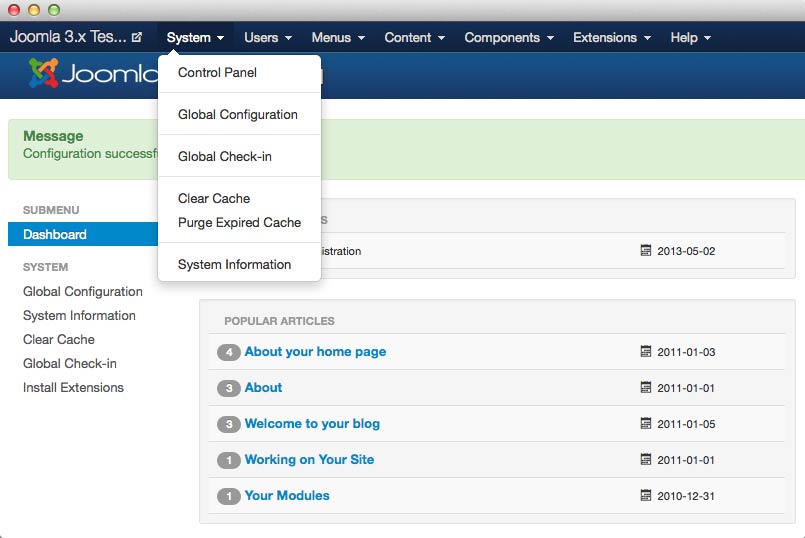 The System menu is home to administrative pages that impact the Joomla system as a whole. This includes the Control Panel (also called the Dashboard), Global Configuration page, Global Check-in, cache controls, and System Information page.