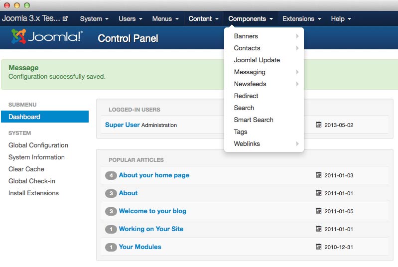 The Components area of the admin menu gives you quick access to configuration pages for various components presently active in your site. Your site's Contacts and Joomla! Update are found here. It is a quick access menu for all the specific mini-applications that make your site, and many of its extensions, do what they do.