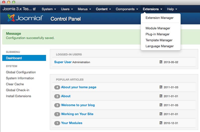Extensions gives you access to the Extension Manager, Module Manager, Plugin Manager, Template Manager, and Language Manager. This is where you would go if you needed to install or remove an extension, configure options for specific extensions, change languages on your site, and manage your site's template. It will likely be your most visited area in the admin menu while you build and configure your site's layout and style.