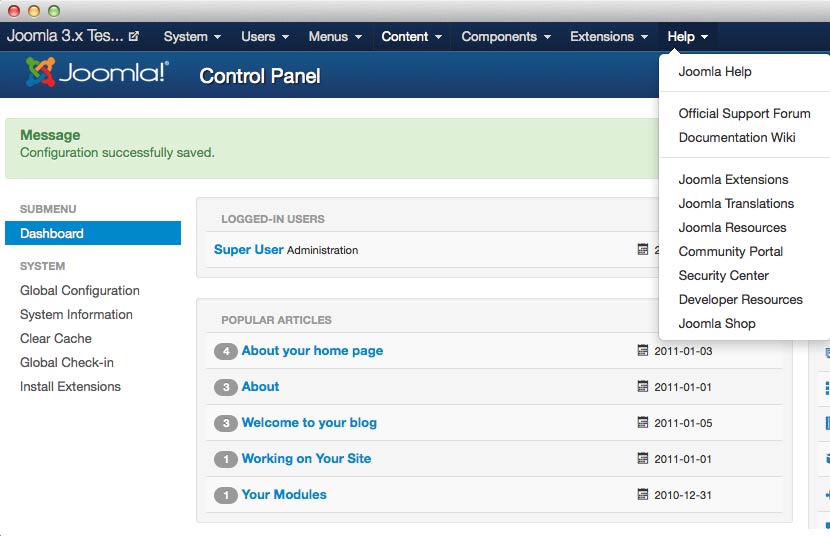 Help is an often overlooked, yet extremely powerful tool for site managers. It gives you access to Joomla's main Documentation Wiki, as well as resources, translations, and developer resources. The Official Support Forum for Joomla is also available here.