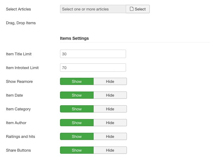 Load image, title, text, read more, voting (style three), category, author from articles. Articles can be selected from one or more categories or other choice to select specific articles.